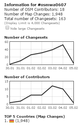 Laut der resultmap von Pascal Neis sind bisher 18 mapper mit 163 changesets und 1948 mapchanges beteiligt http://resultmaps.neis-one.org/osm-changesets?comment=osmwa0607#6/50.827/10.503